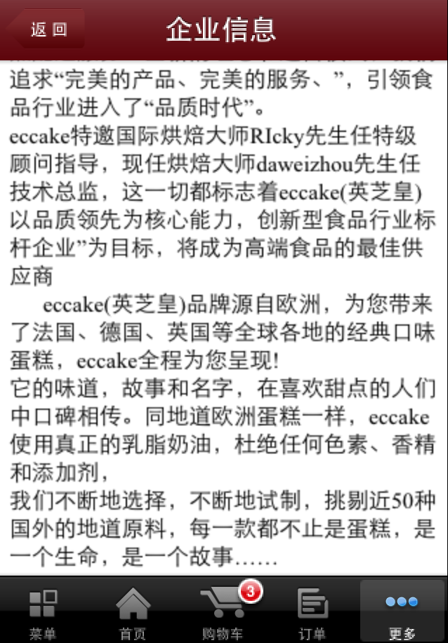 6、企业信息浏览英芝皇蛋糕企业可以发布企业简介、联系我们等宣传信息,让更多顾客及伙伴了解企业,为企业节省印刷及宣传费用。
