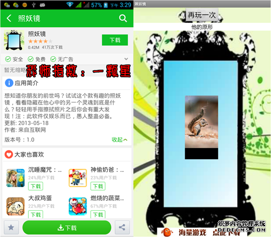 “照妖镜”是一款可查“前世”的APP,可供平时朋友间开玩笑之用,打开照妖镜APP,为朋友照一张照片,然后像刮“刮刮卡”一样,照妖镜中就会显示出被测者的“前世”,上图中的被测者前世就是一只松鼠。该APP仅供娱乐,所有“前世”身份、形象随机展现哦。