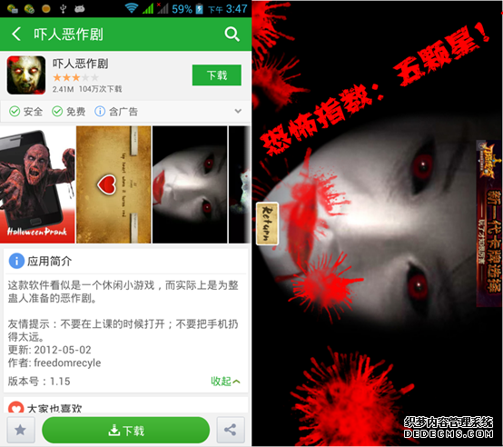 上面介绍了三款小儿科的APP应用,真正的重头戏来了。万圣节吓人“秘笈”——吓人恶作剧。这款APP采用了很高的伪装技巧,菜单界面是游戏模式,用户任意选择关卡,聚精会神的解谜之际,会突然蹦出“鬼”,并伴有骇人的声效。由于比较突然,受惊吓指数较大。这款APP的恐怖指数和危险指数都比较高,整蛊时除了要考虑“友尽”的可能外,还要做好万全的措施保护手机安全。