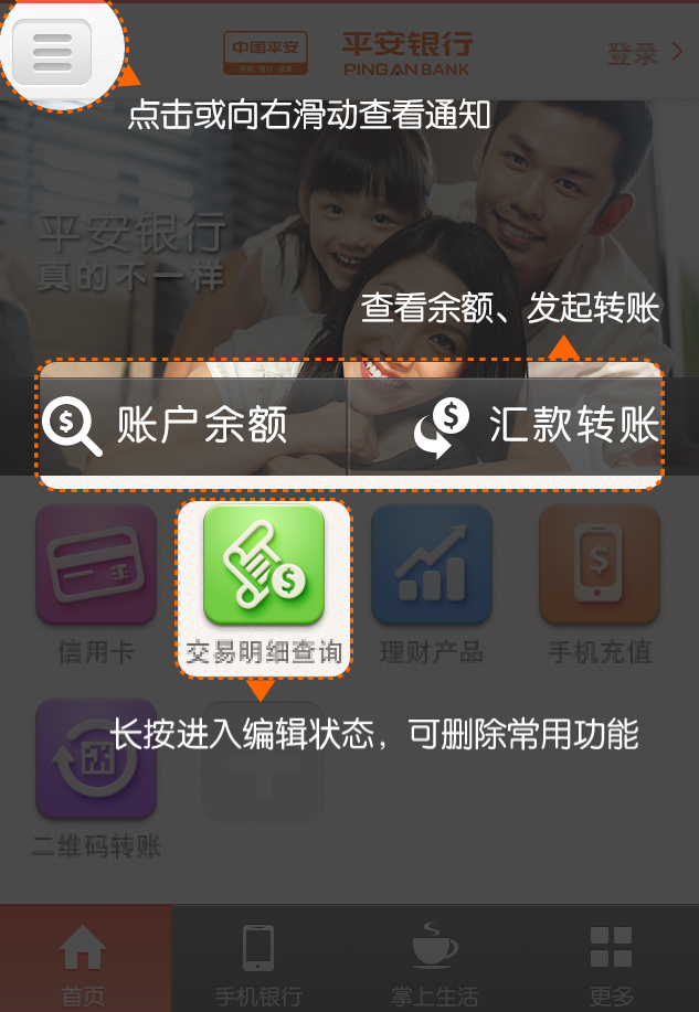 5.特色功能-实时转账:平安手机银行实时转账功能,没有周末节假日限制,任何时间转账实时到账,跨行异地转账手续费全免.网银注册还没有注册平安网银的客户,下载后点击首页右上角的“注册”按钮即可,方便快捷。非平安银行客户,可以使用“更多”中的“网点查询”、“费率查询”和“我的账本”等功能。